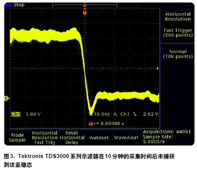 圖3 是嘗試用Tektronix TDS3000 系列示波器捕獲同樣的異常事件該示波器采用默認(rèn)的實時采集模式具有10 k 點的最大存儲器。由于在此特定條件下的示波器更新不到每秒 800 次把探頭放在測試點上 10 秒后我們未捕獲到任何異常。在這一更新率下一般需要在該測試點上探測 1 分鐘才能捕獲到每 50,000個周期平均僅產(chǎn)生一次的一個偶發(fā)毛刺。