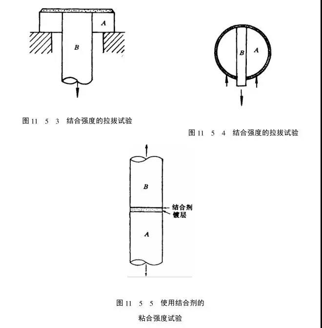 如圖11_5_5所示,對圓柱形試樣A的端面進行粗糙處理后進行噴涂,制成試驗所要求的涂層,涂層厚度依要求而定(最小厚度一般不小于0.4mm)。同時在同等材料和尺寸的圓柱形試樣g的端面進行粗化處理,在試樣A的涂層面和9的粗化面上,各涂上一層薄而均勻的粘合劑,將試樣A置于試樣9上,使軸心重合,并加以適當壓力使其充分粘合,勿使氣泡殘留在粘合劑中,溢出的粘合劑應清除,待固化后進行拉拔試驗。