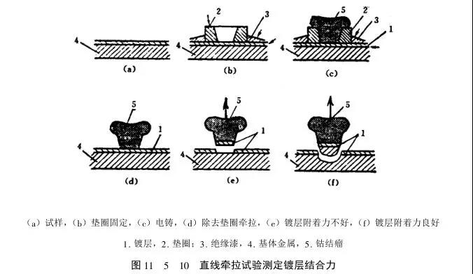 直線章拉試驗可直接在鍍件上進行。首先在試件鍍層表面,用一非導體墊國固定在被測部位上,并在墊國以外的鍍層表面加以絕緣層,然后在墊國以內(nèi)的鍍層上電鑄鈷或其它金屬,經(jīng)一定時間,在該鍍層上沿墊國內(nèi)壁形成一個金屬結(jié)瘤,電鑄結(jié)束后取下墊國,除去絕緣層,將鑄有金屬結(jié)瘤的試件置于專用的張力測試機上,以機械力將般層牽拉至斷裂見圖11_5_10。根據(jù)般層剝離時用力的大小及般層結(jié)合面積可計算出般層的結(jié)合強度。